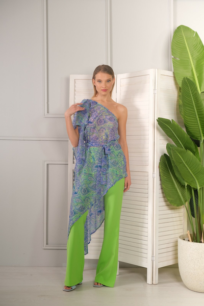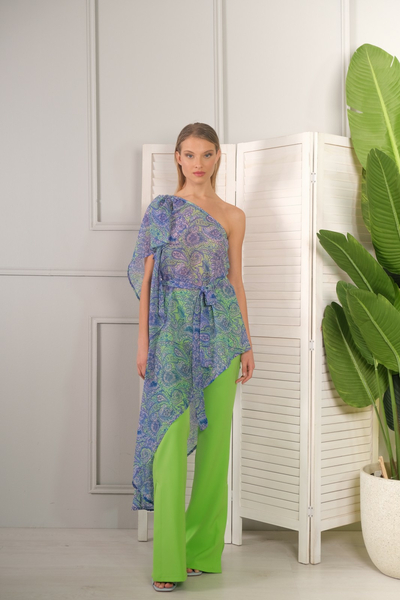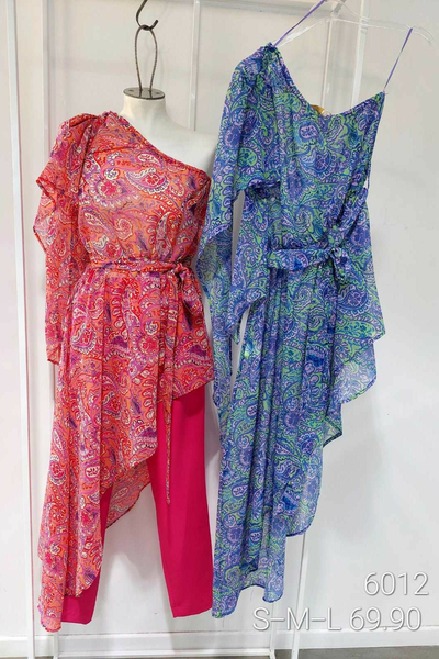 Ασύμμετρη εμπριμέ τουνίκ με έναν ώμο με λάστιχο στη μέση και ζώνη