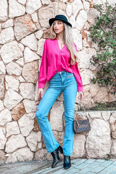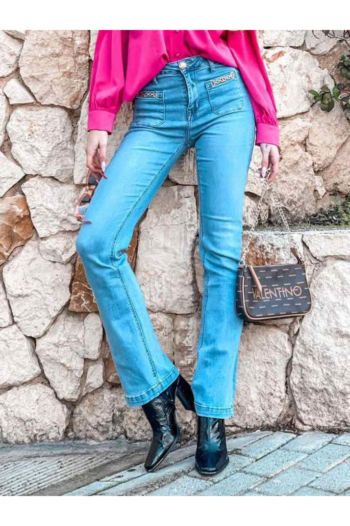Τζιν παντελόνι καμπάνα με τσέπες μπροστά.