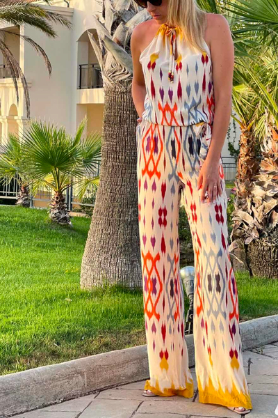 Ολόσωμη φόρμα εμπριμέ. Δέσιμο στο λαιμό. Λάστιχο στη μέση. Ύφασμα ανάλαφρο και δροσερό.
