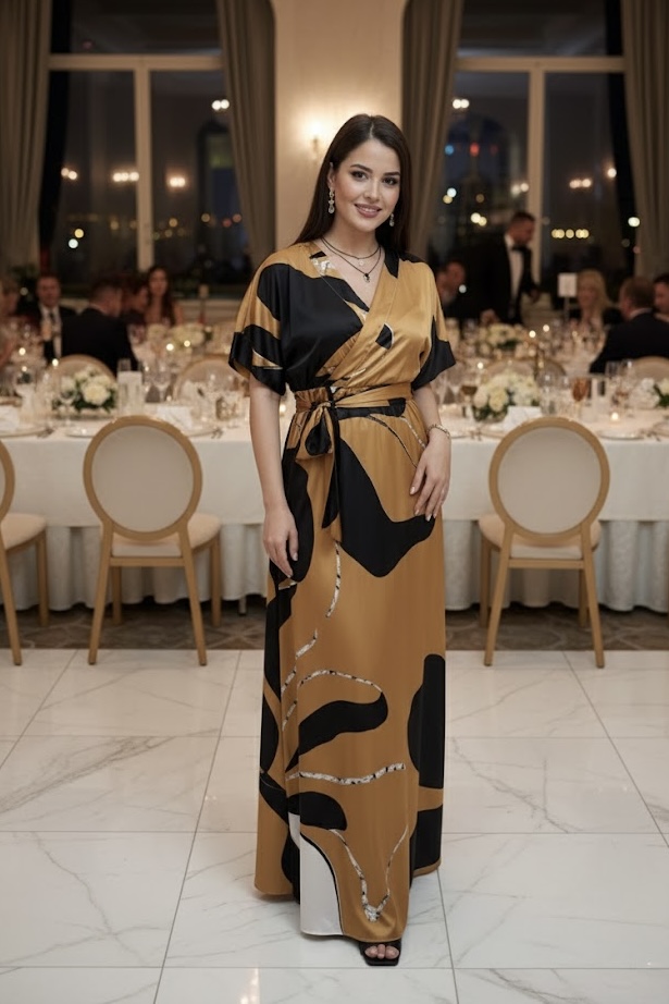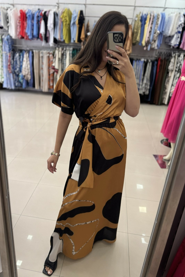 Φόρεμα μάξι. Εμπριμέ σατέν. Κρουαζέ στο μπούστο.