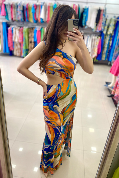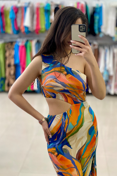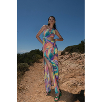 Εμπριμέ maxi φόρεμα με cut outs και άνοιγμα στο κάτω μέρος