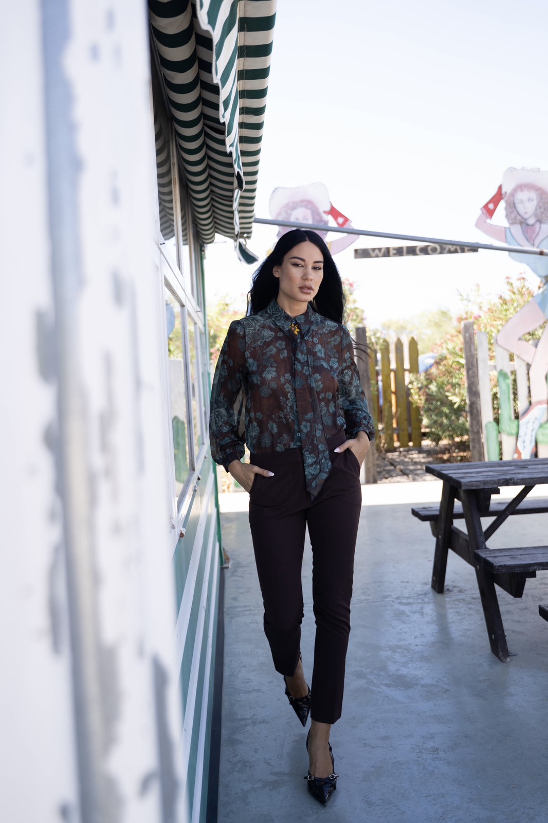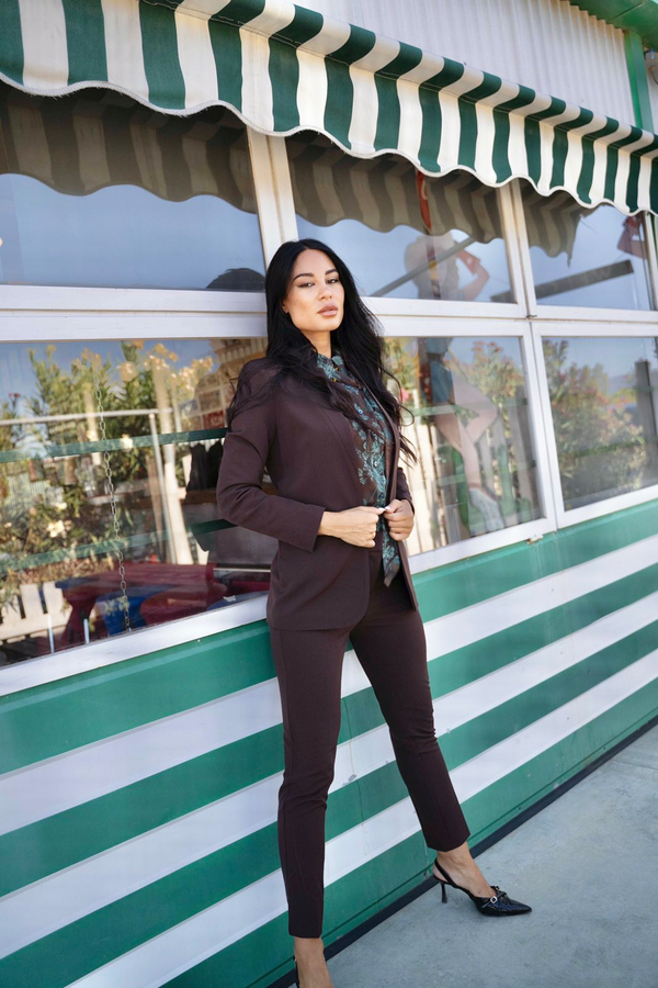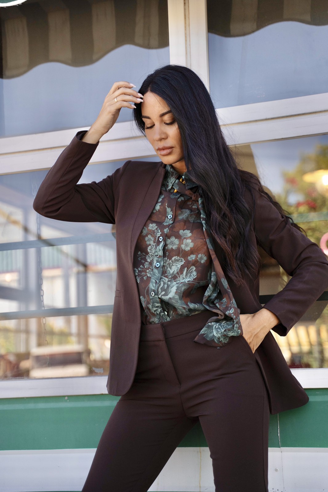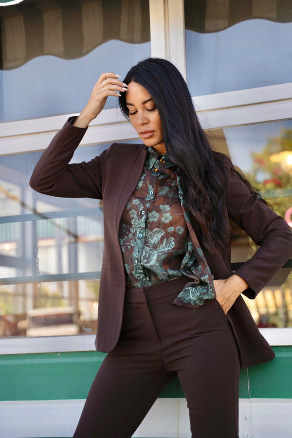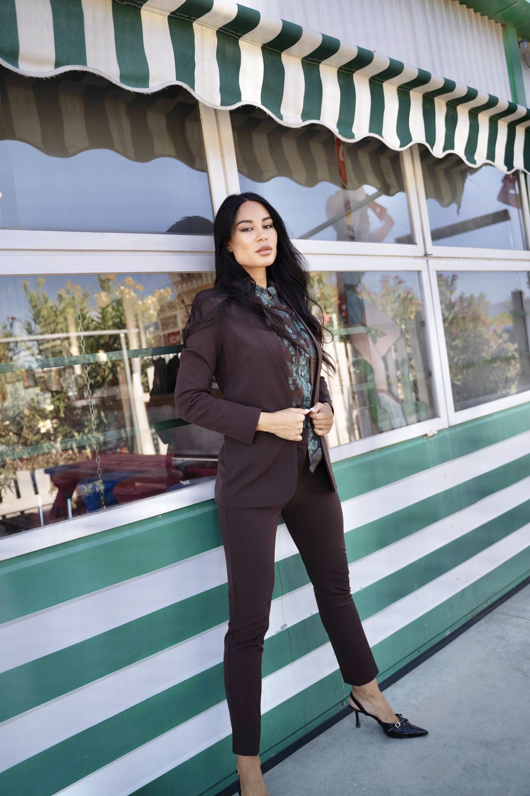 Κουστούμι κρεπ. Σακάκι με μάο γιακά, χωρίς κουμπί.