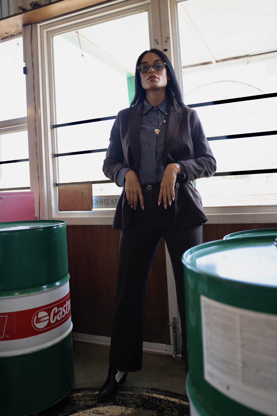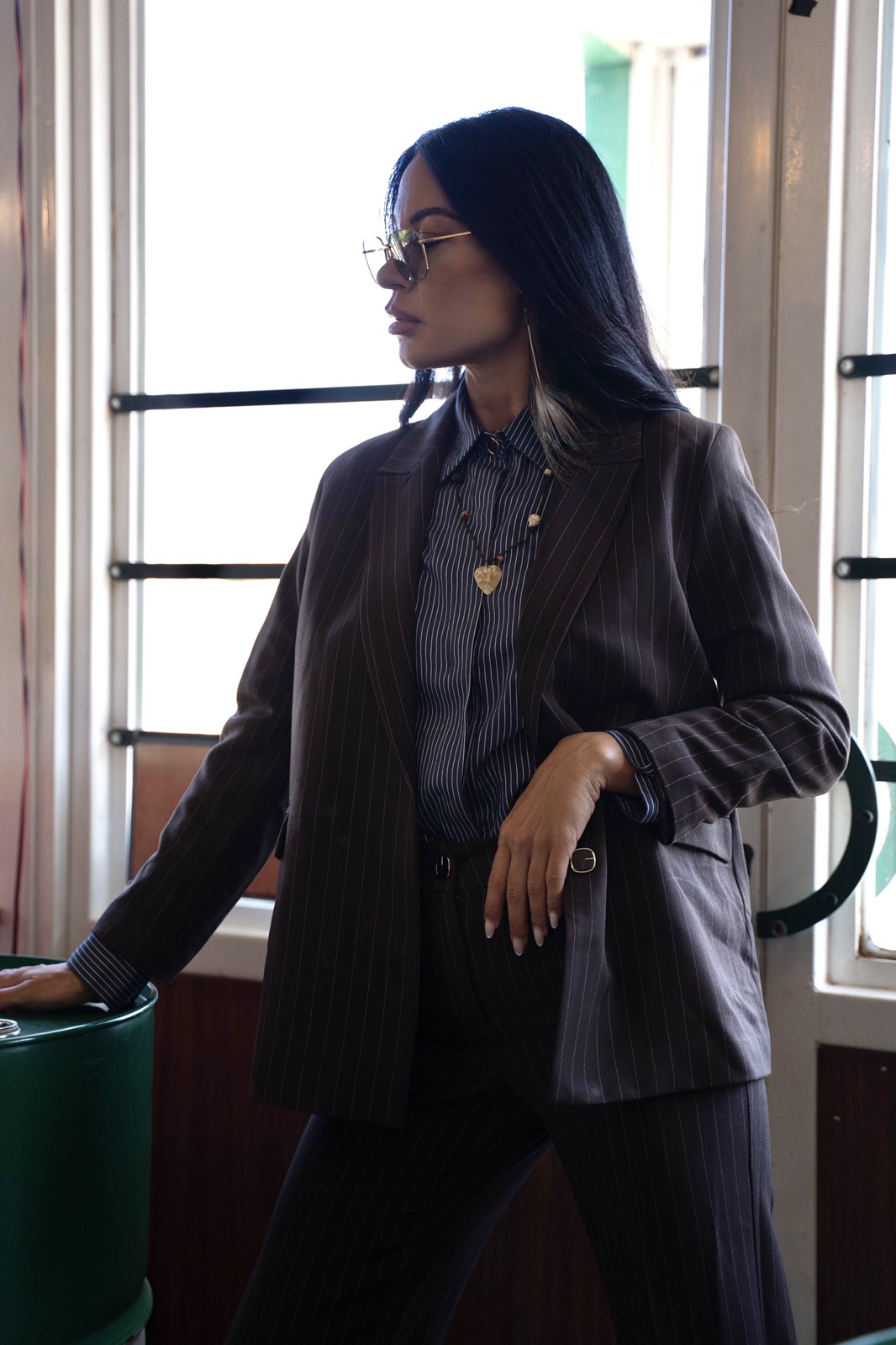 Κουστούμι ριγέ TR. Σακάκι με κουμπιά και τσέπες.