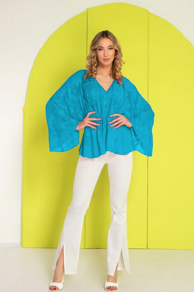 Μπλούζα με ανάγλυφο σχέδιο, με V στο μπροστινό μέρος. Έχει λάστιχο κάτω από το μπούστο.