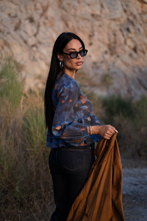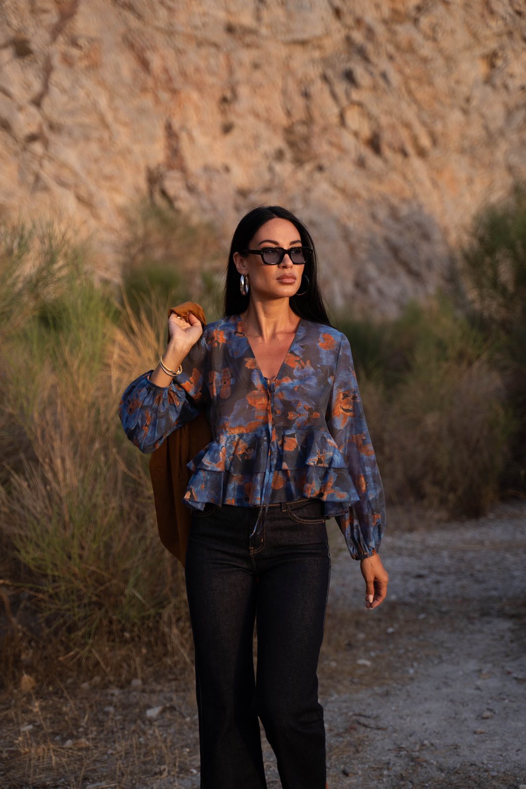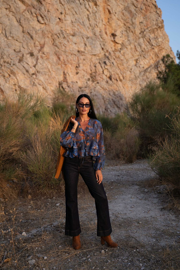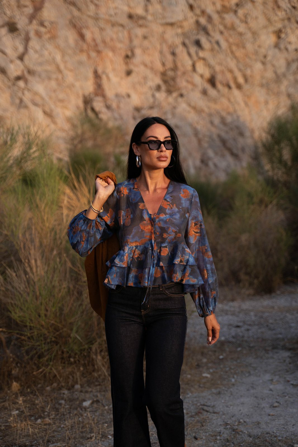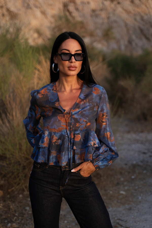 Μπλούζα εμπριμέ. Βολάν στο τελείωμα.