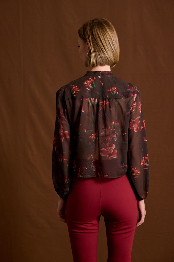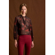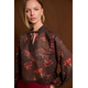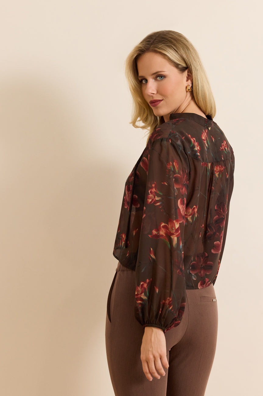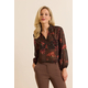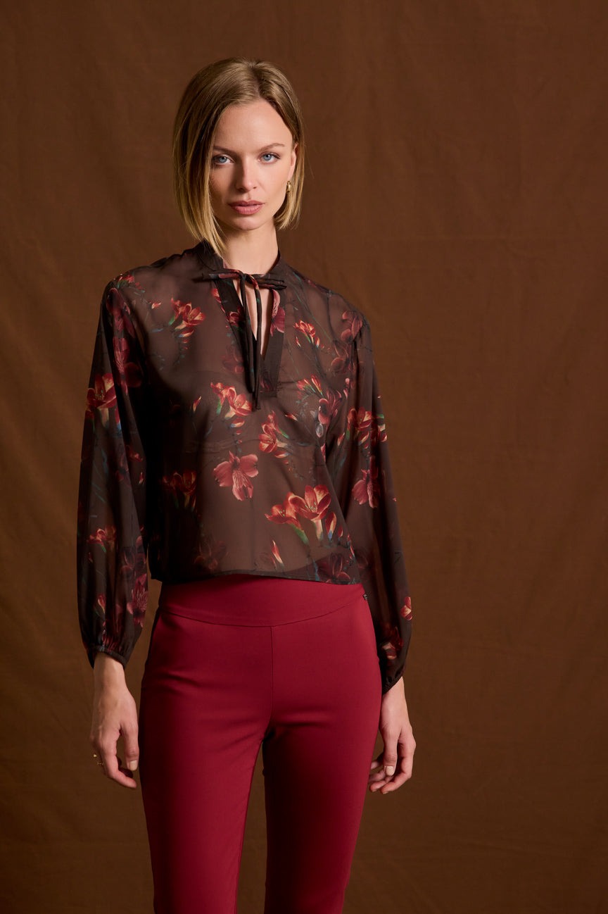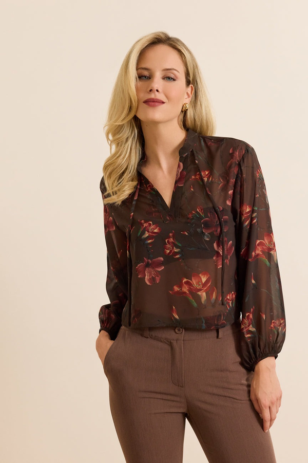 Μπλούζα εμπριμέ με δέσιμο. Σταθερό ύφασμα, μουσελίνα ημιδιάφανη.