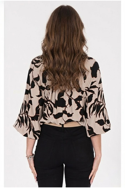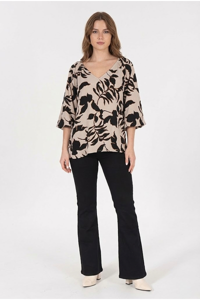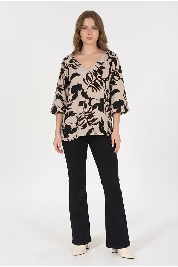 Μπλούζα rayon εμπριμέ με V και λάστιχο στα μανίκια.