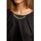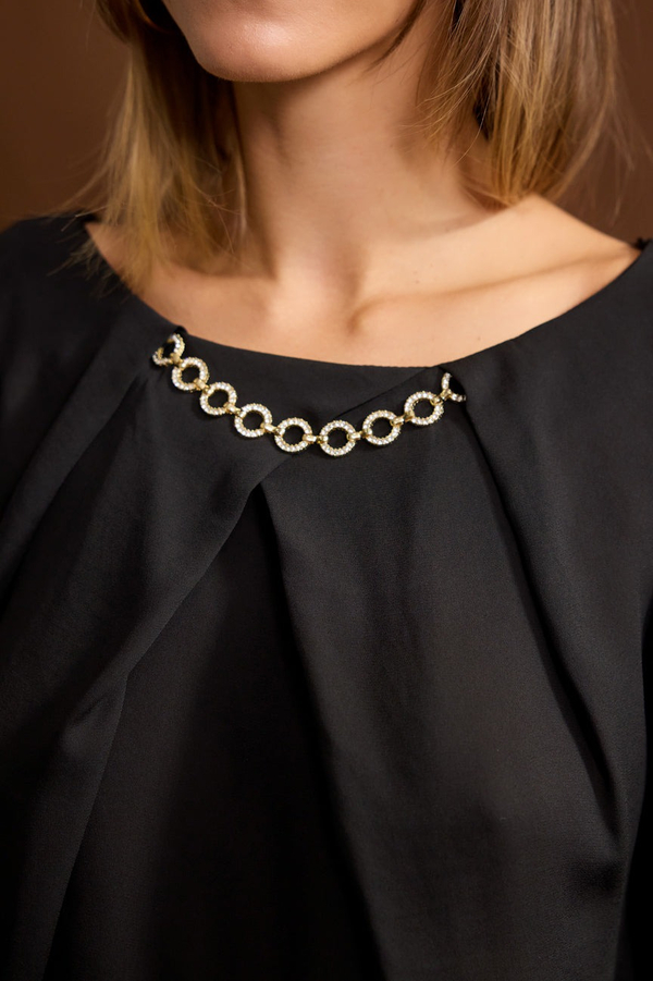 Λαιμόκοψη με μεταλλική λεπτομέρεια, κλείσιμο με κουμπί πίσω.