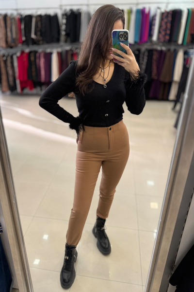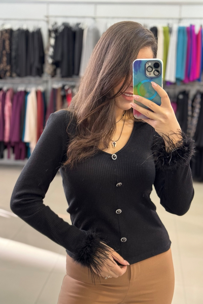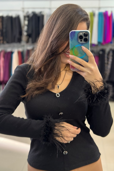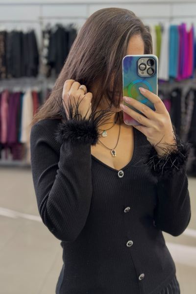 Μπλούζα πλεκτή με διακοσμητικά κουμπιά και μαραμπού φτερά στα μανίκια
