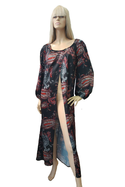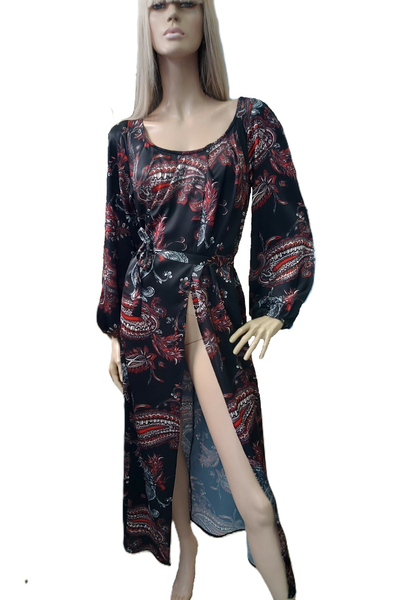 Λάστιχο στα μανίκια. Συνοδεύεται από ζώνη στο αντίστοιχο ύφασμα.