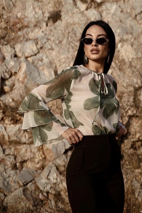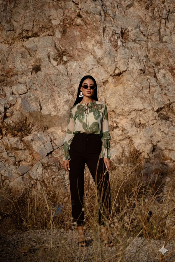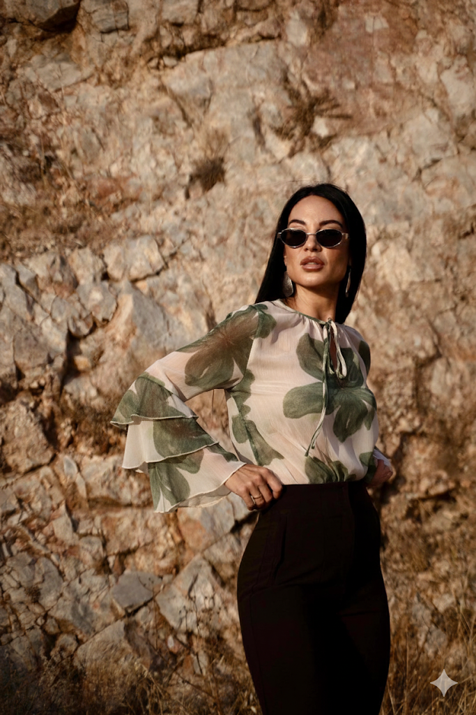 Βολάν στα μανίκια. Δέσιμο στο λαιμό.