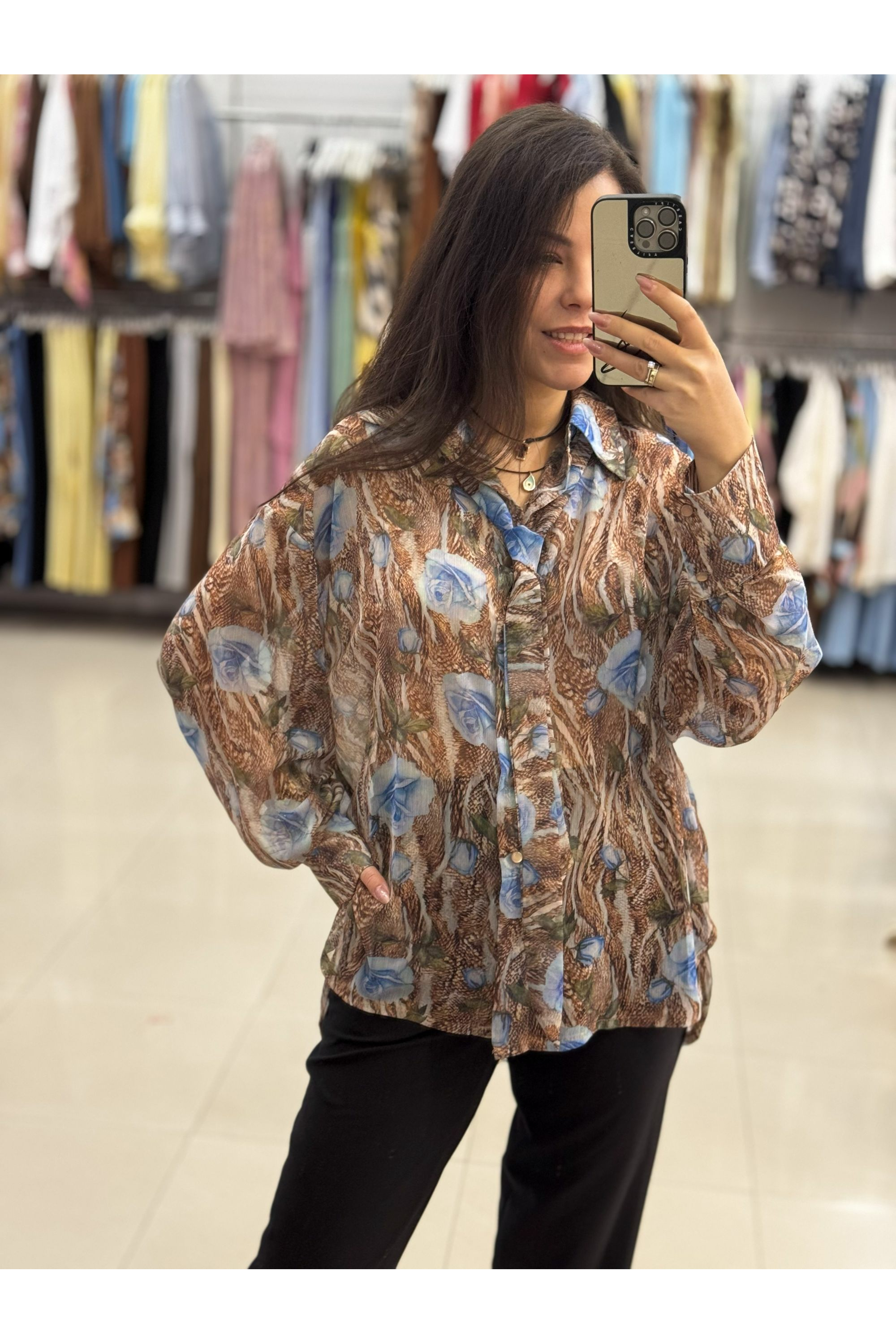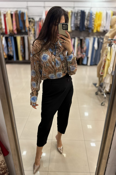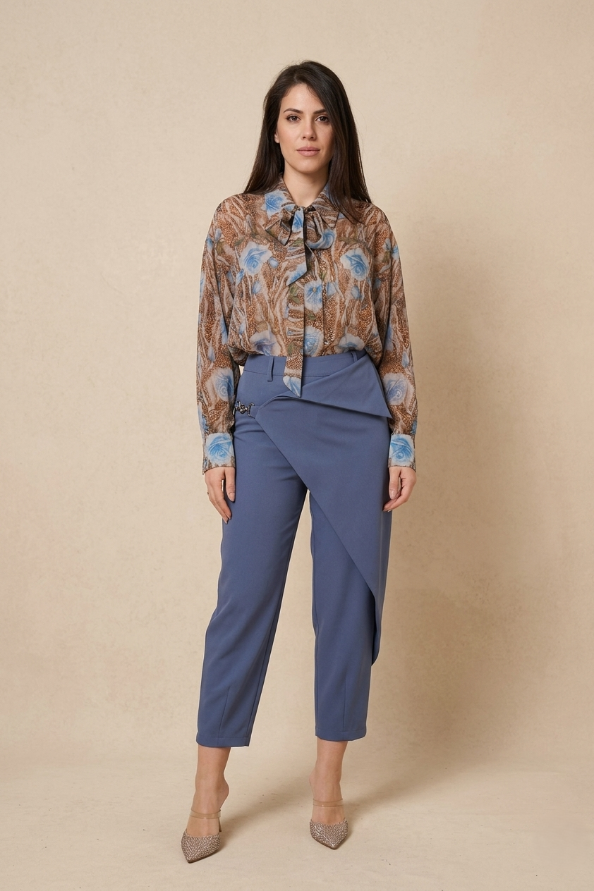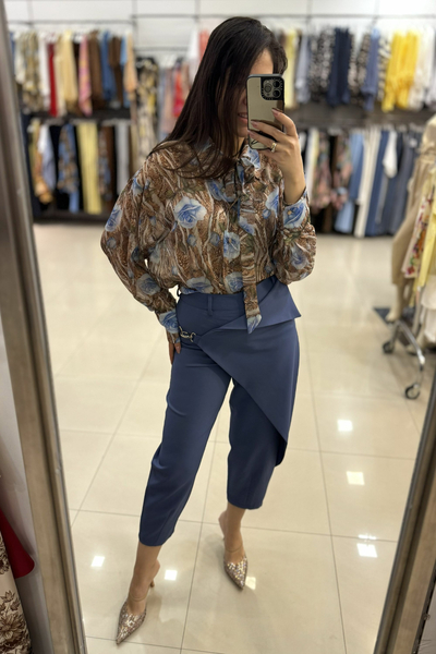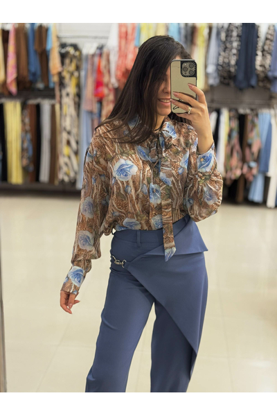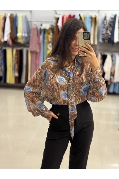 Είναι κατασκευασμένο από ένα ανάλαφρο, ημιδιαφανές ύφασμα (σifon). Το μοναδικό μοτίβο συνδυάζει μια βάση σε καφέ τόνους (που θυμίζει animal print) με μεγάλα, stylized μπλε τριαντάφυλλα και πράσινες λεπτομέρειες, δημιουργώντας μια έντονη και καλλιτεχνική αντίθεση. Διαθέτει μακριά μανίκια με φαρδιές μανσέτες και κουμπιά.
