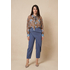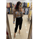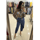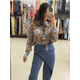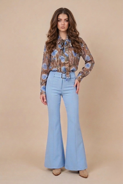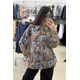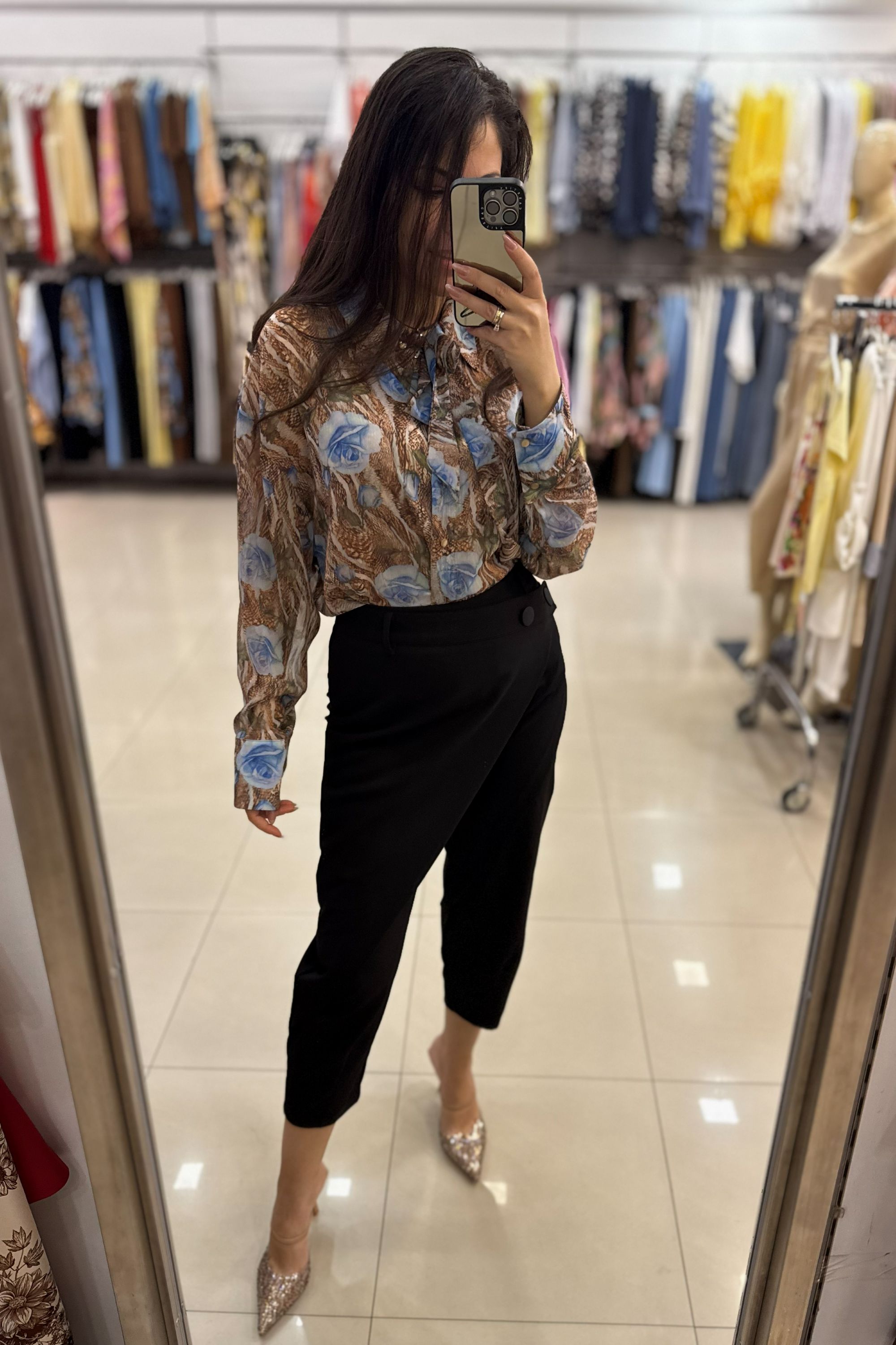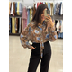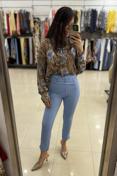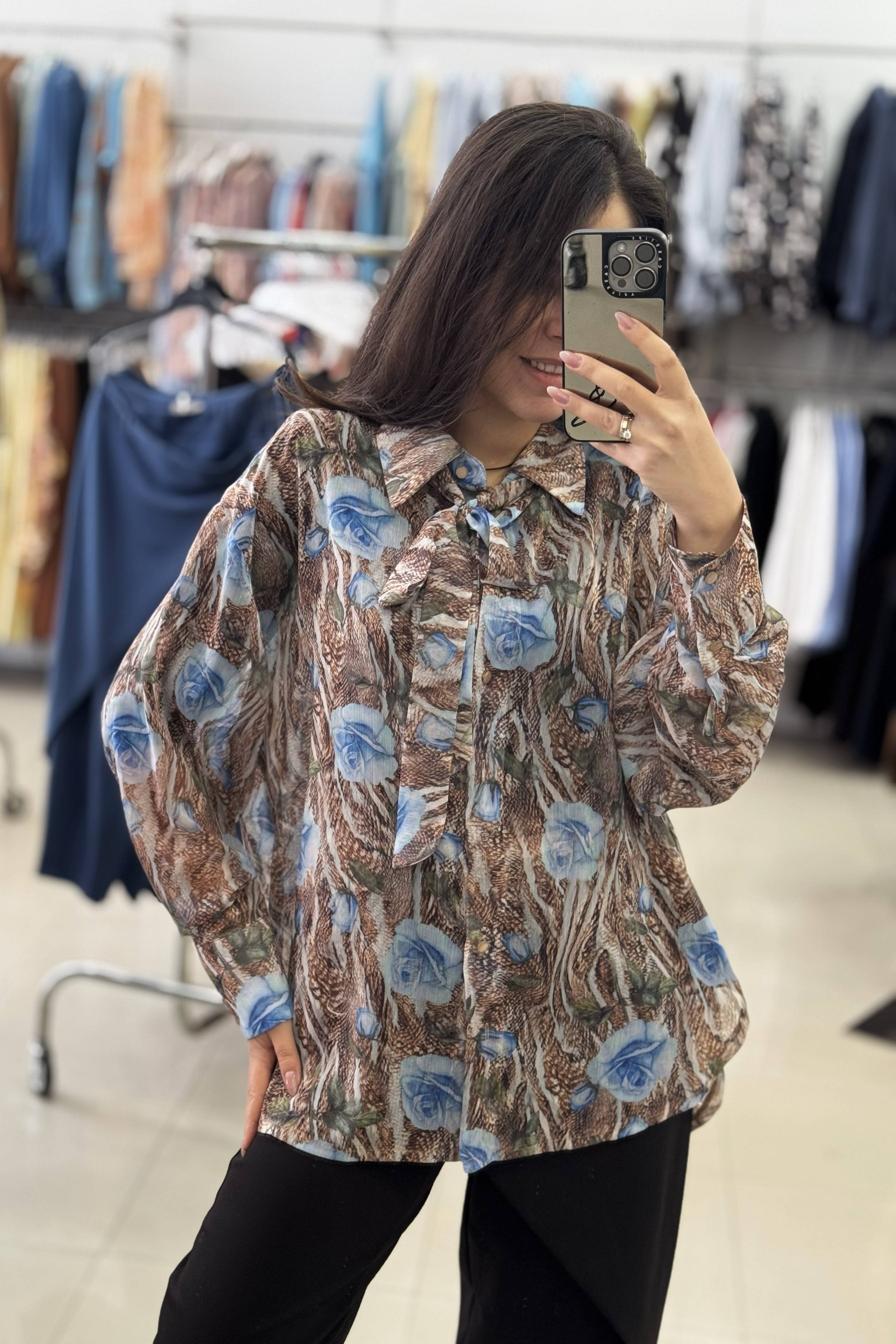Είναι κατασκευασμένο από ένα ανάλαφρο, ημιδιαφανές ύφασμα (σifon). Το μοναδικό μοτίβο συνδυάζει μια βάση σε καφέ τόνους (που θυμίζει animal print) με μεγάλα, stylized μπλε τριαντάφυλλα και πράσινες λεπτομέρειες, δημιουργώντας μια έντονη και καλλιτεχνική αντίθεση. Διαθέτει μακριά μανίκια με φαρδιές μανσέτες και κουμπιά.