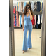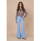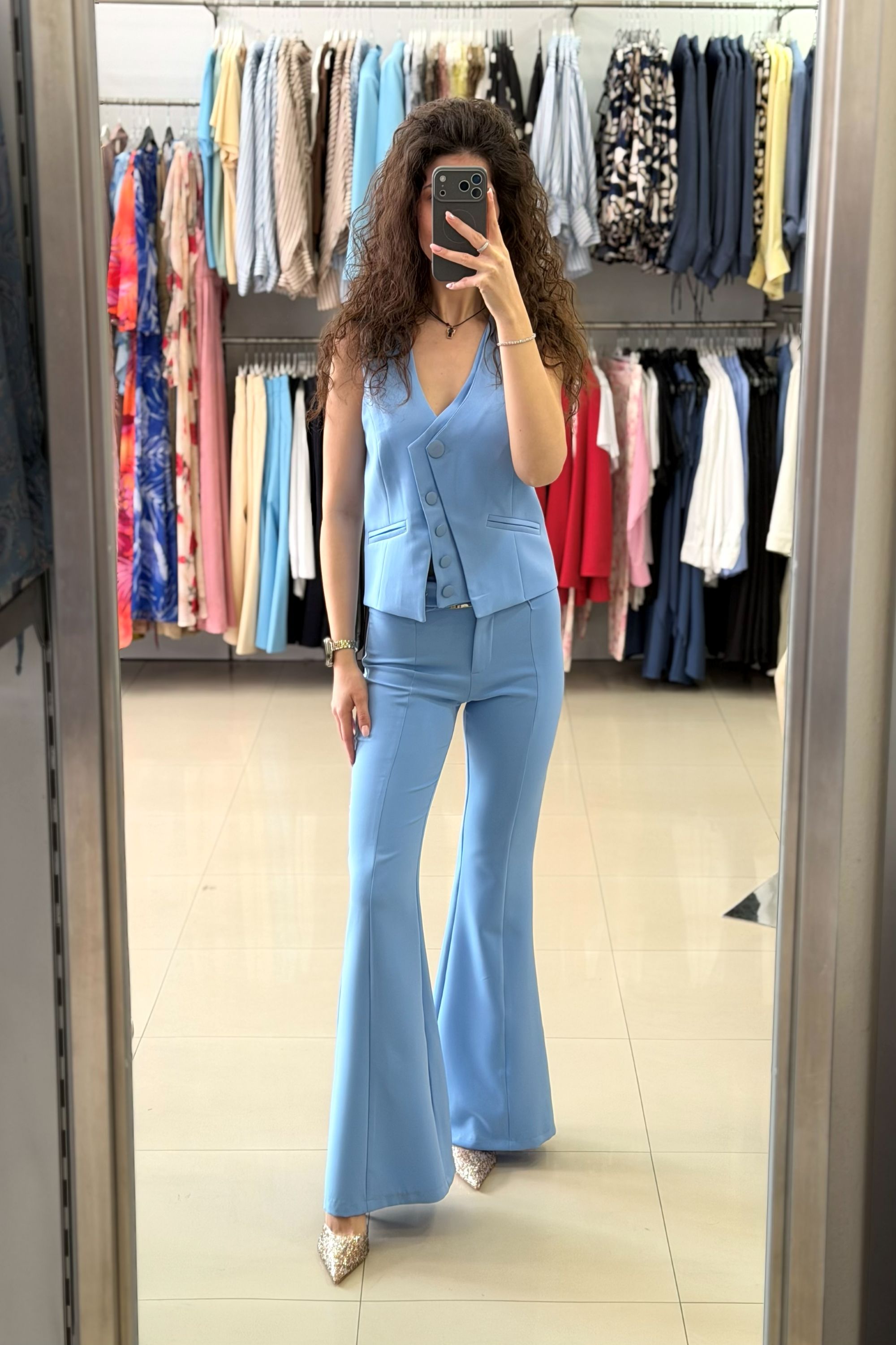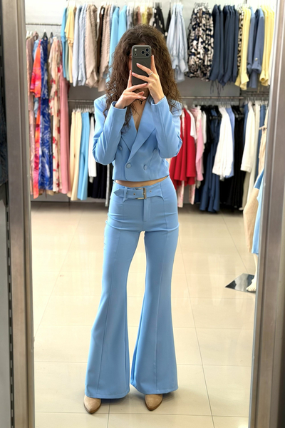 Ψηλόμεσο παντελόνι σε γραμμή καμπάνα (flare) που αναδεικνύει τη σιλουέτα. Διαθέτει ενσωματωμένη ζώνη με χαρακτηριστική μεταλλική αγκράφα και κάθετες ραφές στο μπροστινό μέρος που επιμηκύνουν οπτικά το σώμα. Ο σχεδιασμός του προσφέρει την τέλεια ισορροπία ανάμεσα στο office look και τη βραδινή κομψότητα.