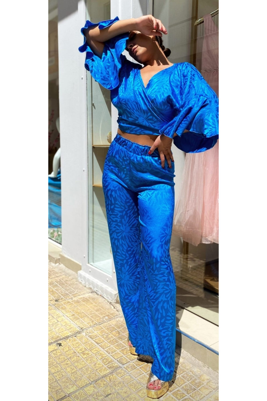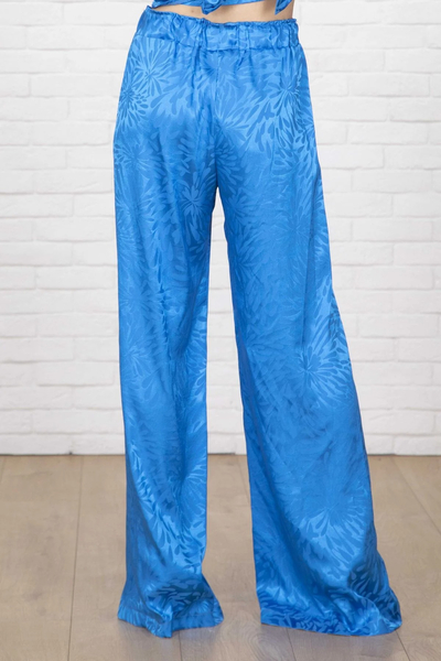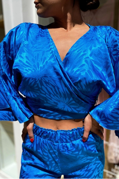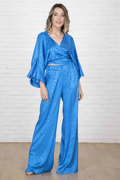 Σετ σατέν παντελόνα με μπλούζα που δένει κρουαζέ ή μπροστά με κόμπο