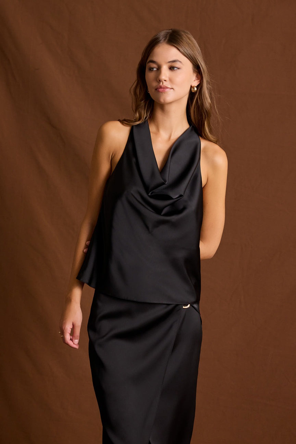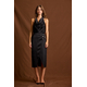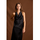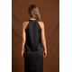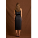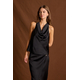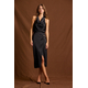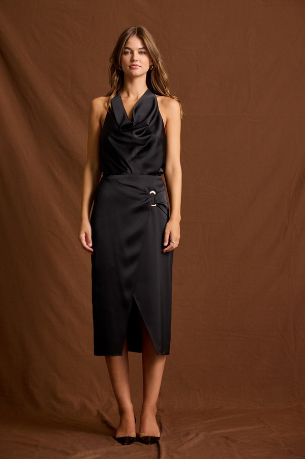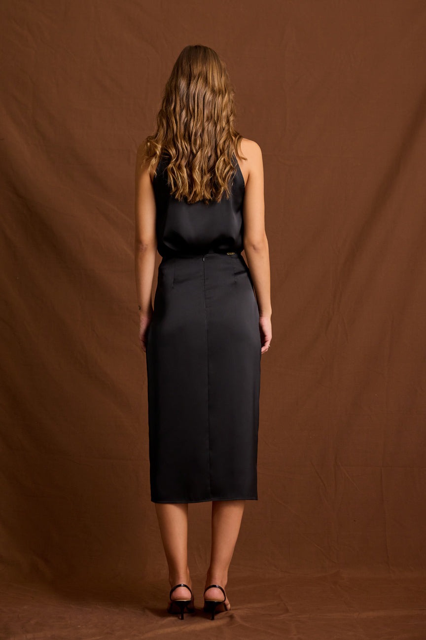 Ντραπέ λαιμόκοψη. Φούστα μίντι με άνοιγμα.