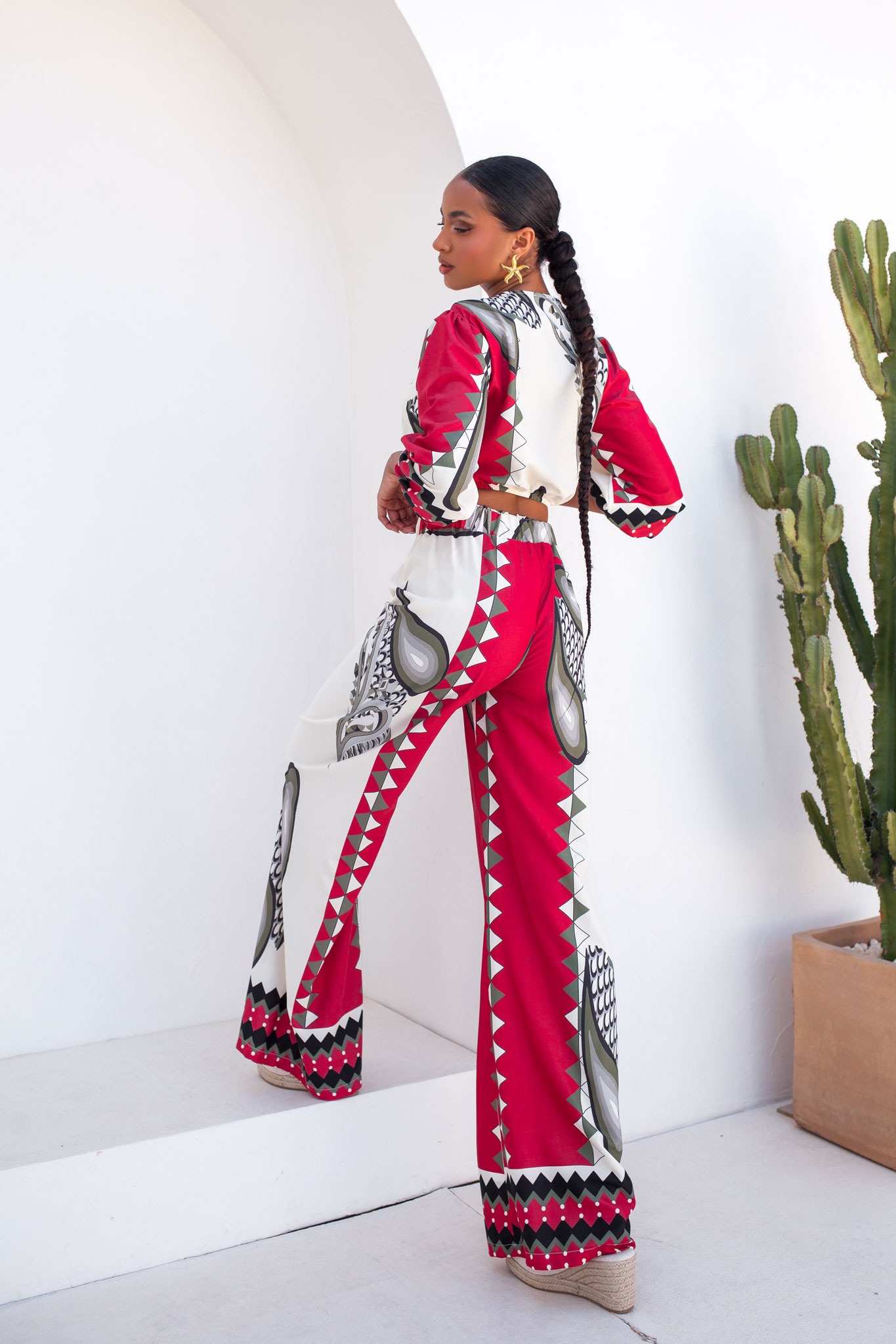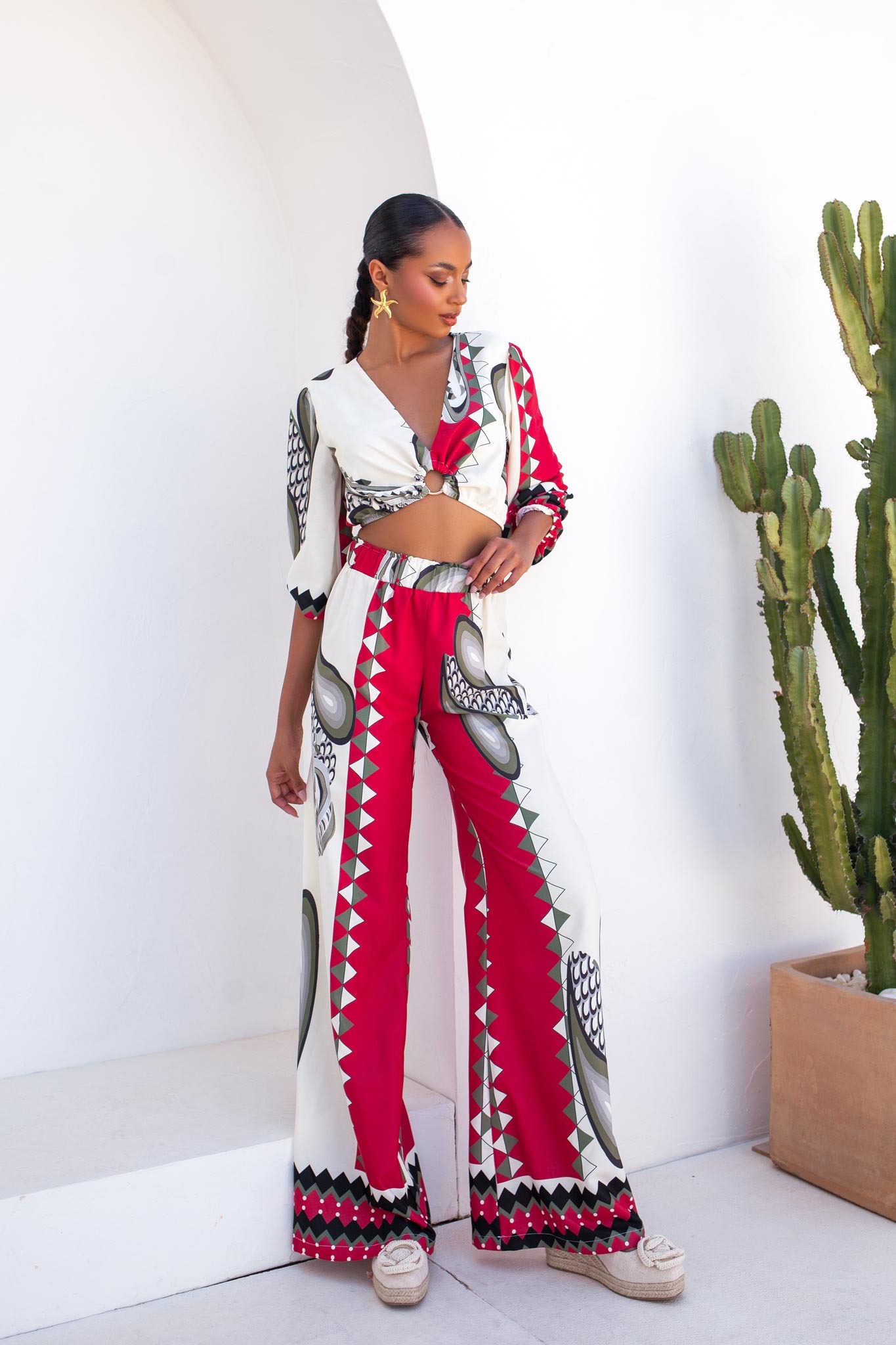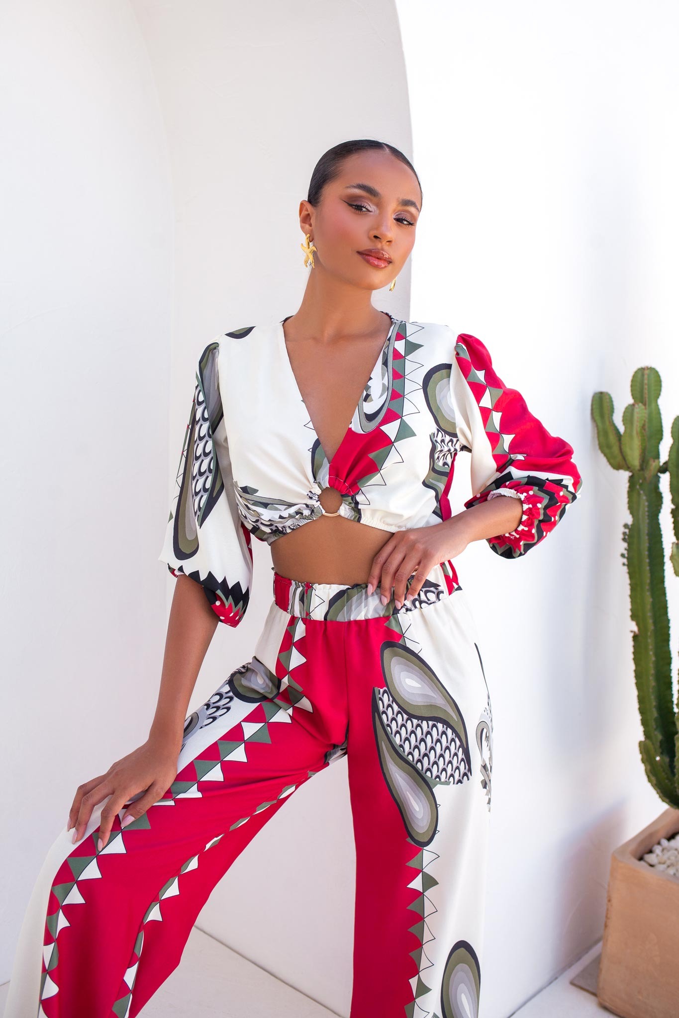 Σετ εμπριμέ. Μπλούζα crop με λάστιχο στα μανίκια.